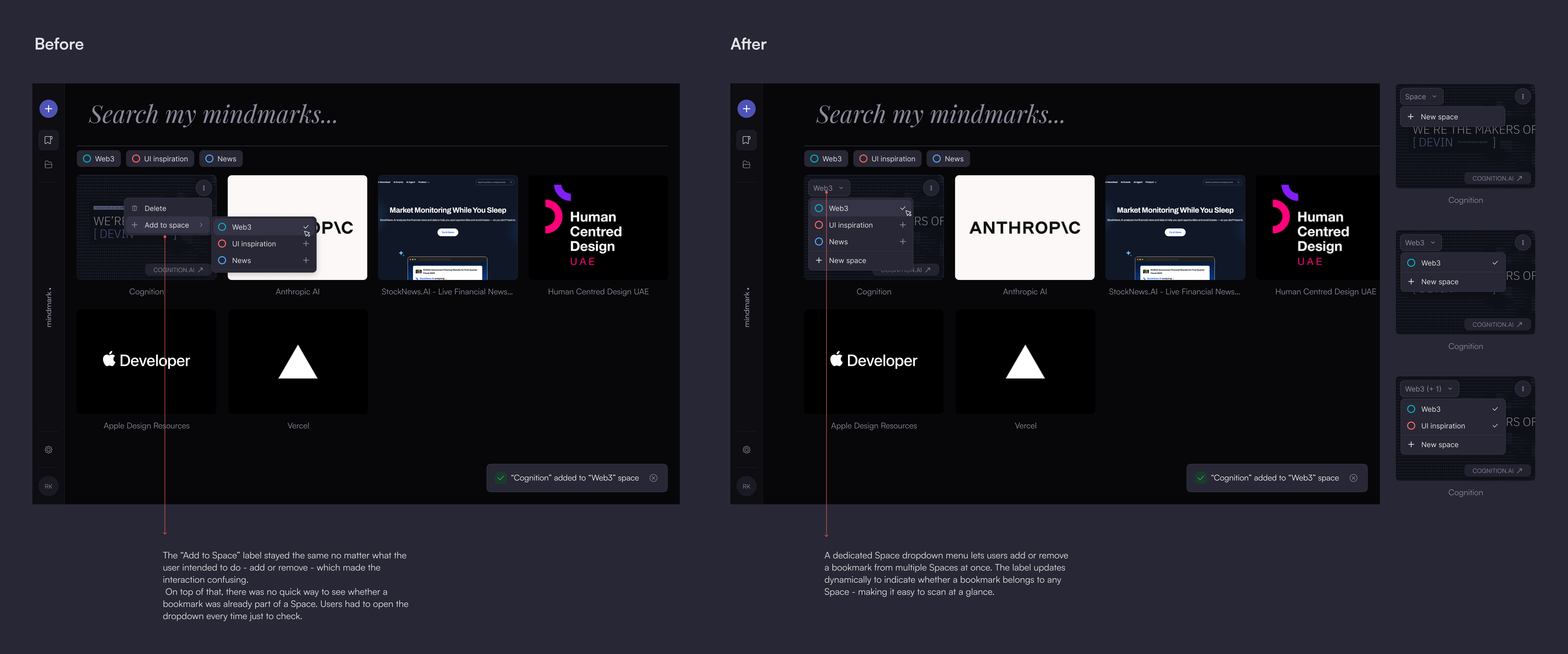 In the first version, adding a bookmark to a Space happened through a hover dropdown - click “Add to Space”, then pick from a list. But once inside a Space, the same control changed to “Remove from Space.” 2 different interactions for the same action - confusing and inconsistent.